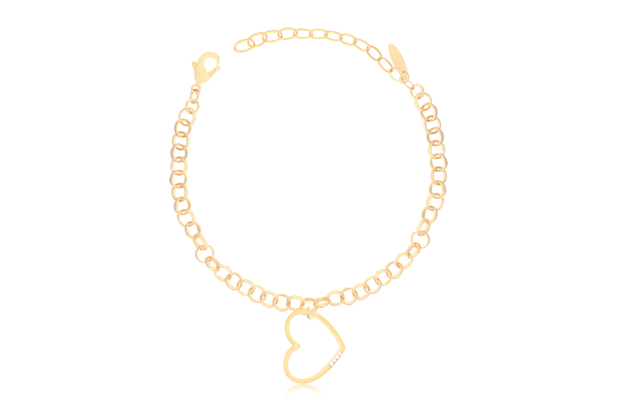 PULSEIRA BANHADA EM OURO, ELO PORTUGUÊS 5mm, 16cm COMPRIMENTO, EXTENSOR 5cm E CORAÇÃO VAZADO 20mm LARGURA