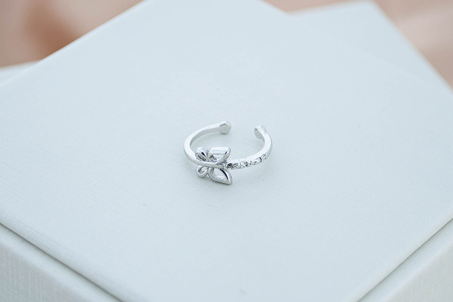 ANEL BANHADO EM RÓDIO BRANCO, ABERTO, BORBOLETA 7mm LARGURA